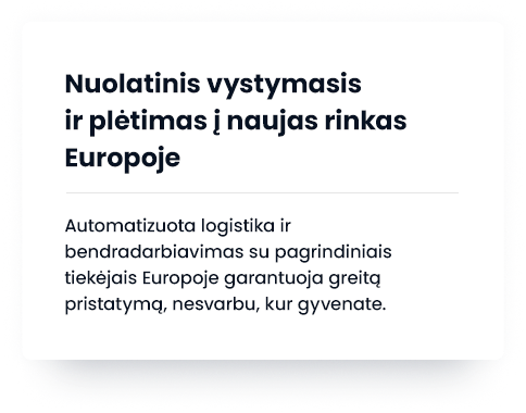 Automatizuoti logistikos procesai garantuoja greitą pristatymo laiką. Siūlome įvairius pristatymo būdus pagal Jūsų poreikius.